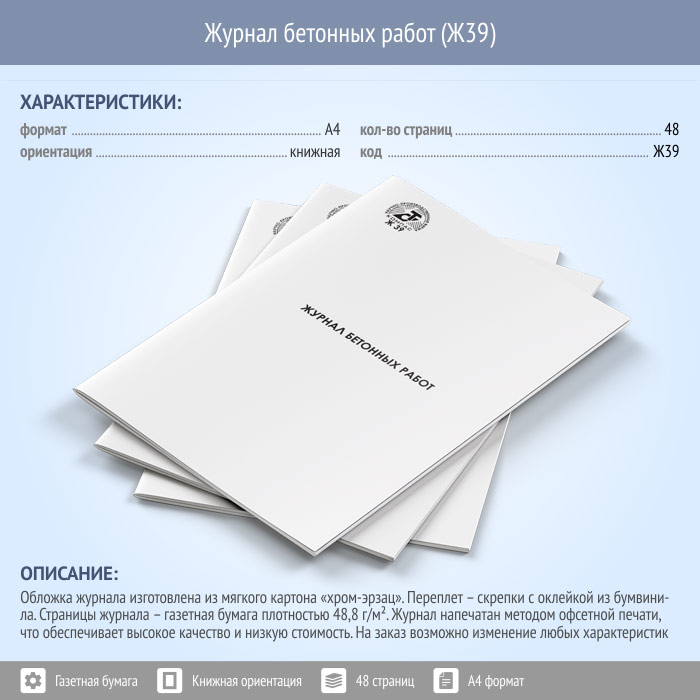 Журнал бетонных работ является одним из основных документов, ведемых на строительном объекте при выполнении работ по бетонированию конструкций. В журнале фиксируются сведения о бетонируемой части сооружения и конструктивных элементах, характеристиках бетонной смеси, поставщике, объеме уложенного бетона, а также данные контроля качества и результаты испытаний контрольных образцов.