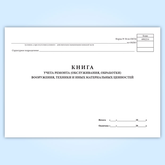 Книга учета ремонта (обслуживания, обработки) вооружения, техники и иных материальных ценностей (форма 36) в Верее купить