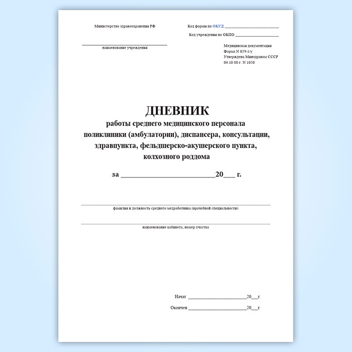 Дневник работы среднего медицинского персонала поликлиники (амбулатории), диспансера, консультации, здравпункта, фельдшерско-акушерского пункта, колхозного роддома (форма 039-1/у) в Верее купить