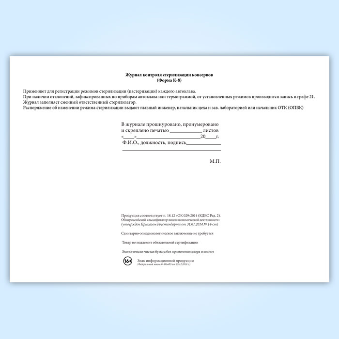 Журнал контроля стерилизации консервов (форма К-8) в Верее купить