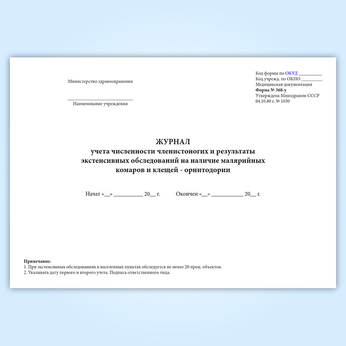 Журнал учета численности членистоногих и результаты экстенсивных обследований на наличие малярийных комаров и клещей - орнитодории (форма № 368-у) в Верее купить