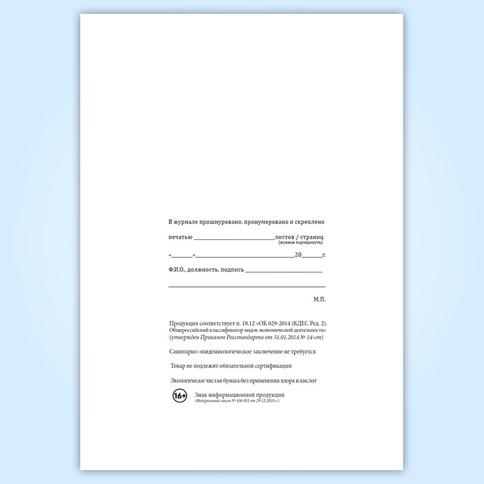 Вы получаете печатную продукцию прошнурованной и c местом для вашей печати в соответствии с действующими нормативными документами: