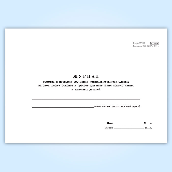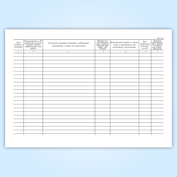 Журнал осмотра и проверки состояния контрольно-измерительных вагонов, дефектоскопов и прессов для испытания локомотивных и вагонных деталей (форма ТУ-113) в Верее купить