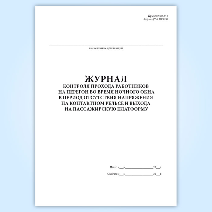 Журнал контроля прохода работников на перегон во время ночного окна в период отсутствия напряжения на контактном рельсе и выхода на пассажирскую платформу (форма ДУ-6 МЕТРО) в Верее купить