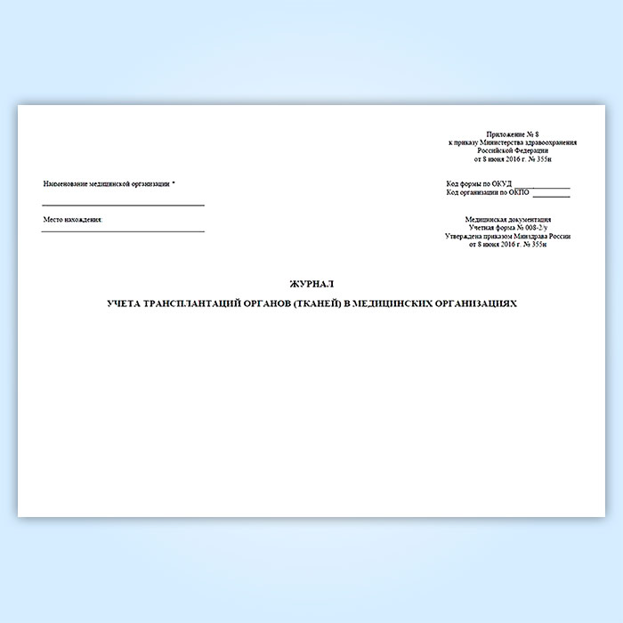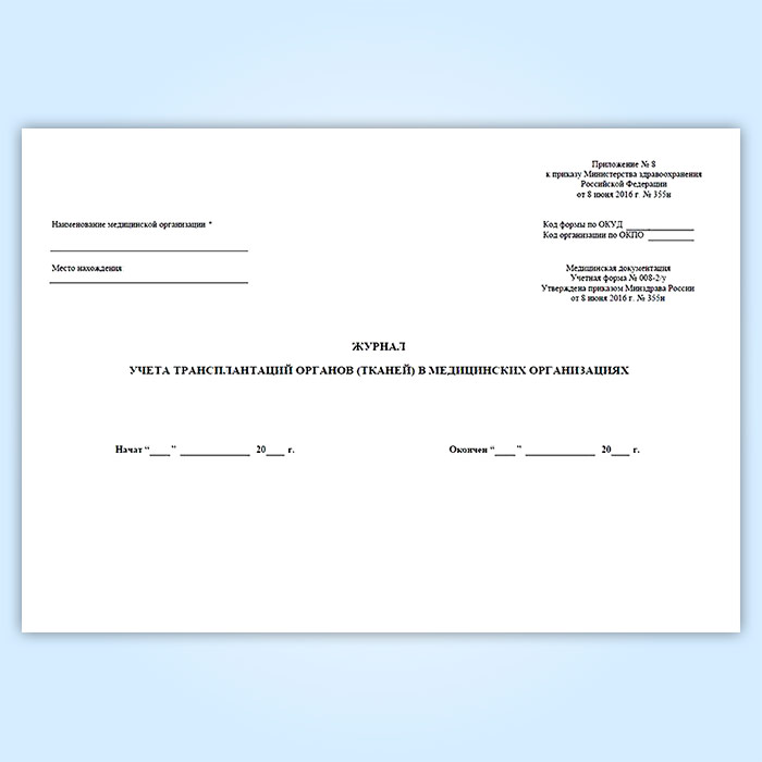 Журнал учета трансплантаций органов (тканей) в медицинских организациях (форма № 008-2/у) в Верее купить
