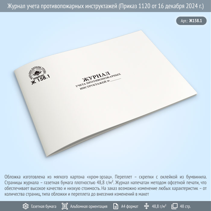 Журнал учета противопожарных инструктажей (Приказ 1120 от 16 декабря 2024 г.) (48 стр., Ж158.1) в Верее купить