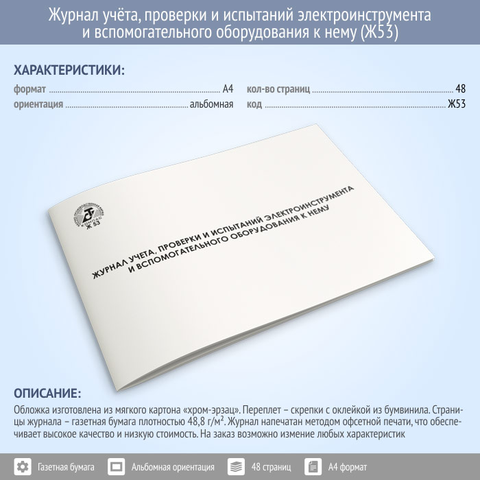 Журнал учета, проверки и испытаний электроинструмента и вспомогательного оборудования к нему (48 стр., Ж53) в Верее купить