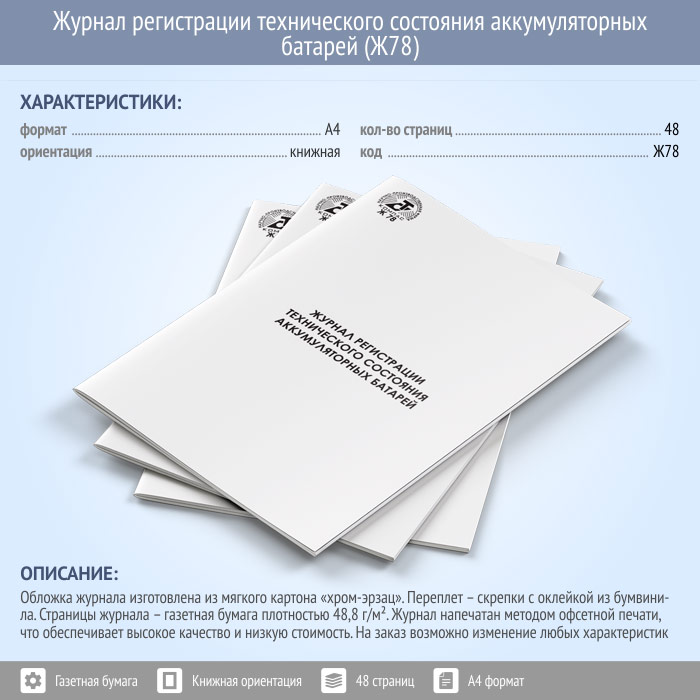 Журнал регистрации технического состояния аккумуляторных батарей (48 стр., Ж78) в Верее купить