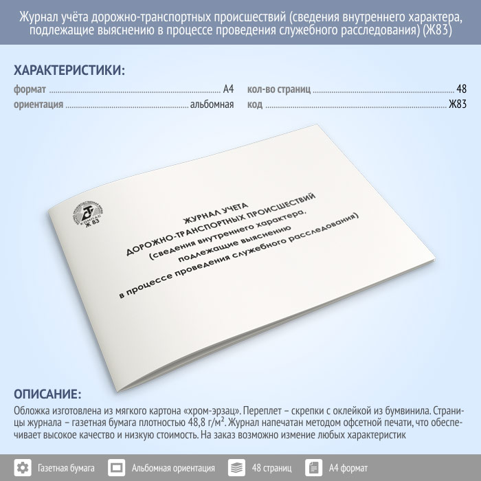 Журнал учета дорожно-транспортных происшествий (сведения внутреннего характера, подлежащие выяснению в процессе проведения служебного расследования) (48 стр., Ж83) в Верее купить
