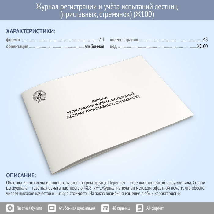 Журнал регистрации и учета испытаний лестниц (приставных, стремянок) (48 стр., Ж100) в Верее купить