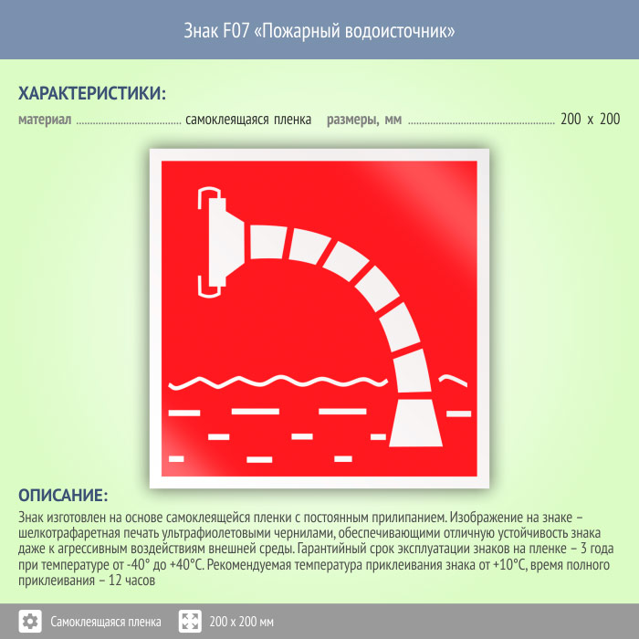 Знак «Пожарный водоисточник» может быть изготовлен любого размера на самоклеящейся пленке, пластике толщиной 0.5, 2 или 4 мм и металле. Также возможно применение фотолюминесцентных и световозвращающих материалов