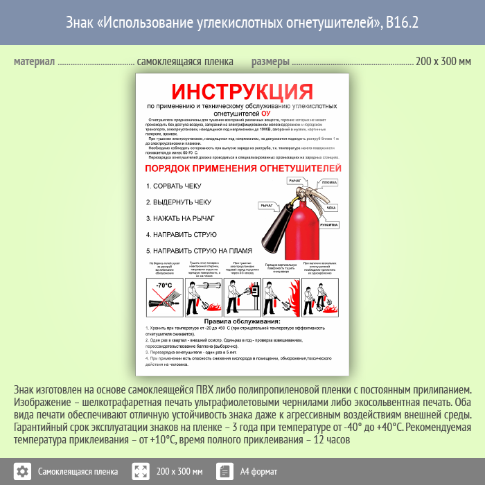 Знак «Использование углекислотных огнетушителей» может быть изготовлен любого размера на самоклеящейся пленке, пластике толщиной 0.5, 2 или 4 мм и металле. Также возможно применение фотолюминесцентных и световозвращающих материалов