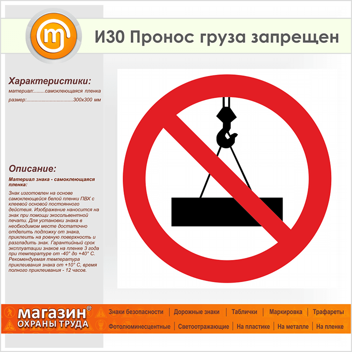 Табличка «Пронос груза запрещен» предполагает, что в данном месте пронос груза запрещается. Код знака: И30