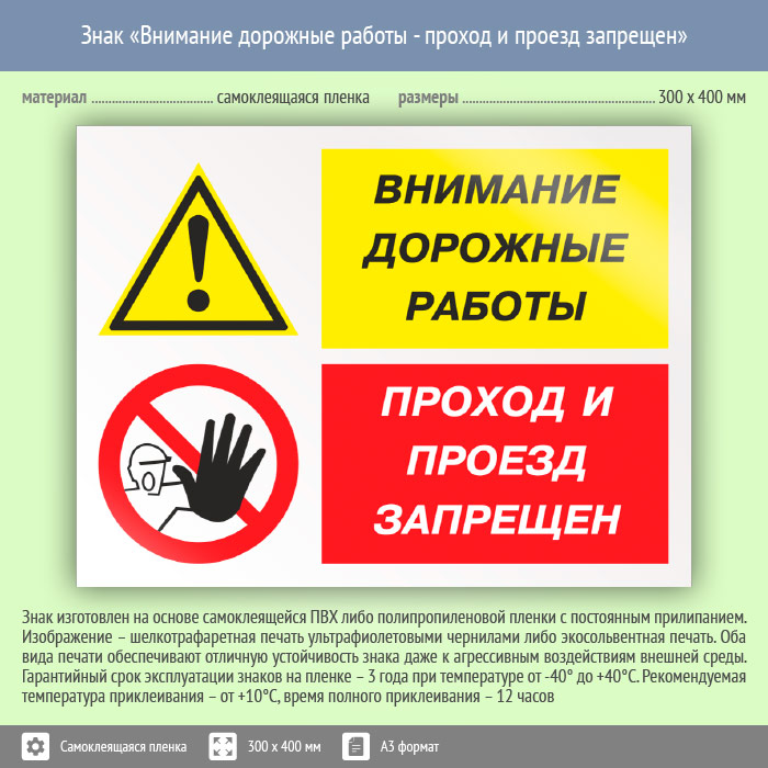 Знак «Внимание дорожные работы – проход и проезд запрещен» может быть изготовлен любого размера на самоклеящейся пленке, пластике толщиной 0.5, 2 или 4 мм и металле. Также возможно применение фотолюминесцентных и световозвращающих материалов