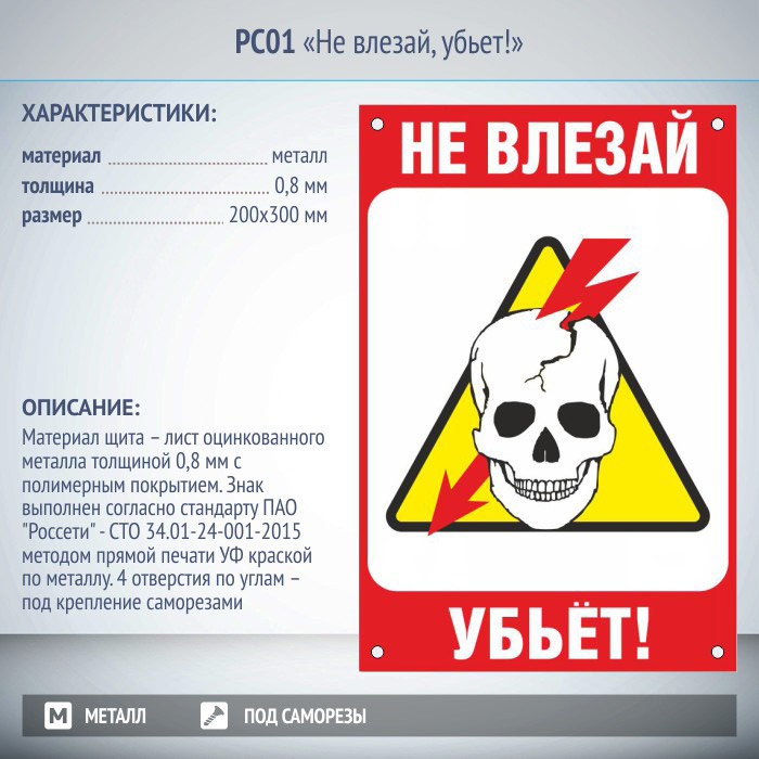 Знак «Не влезай, убьет!», РС01 (металл, 200х300 мм, отверстия под саморезы) в Верее купить