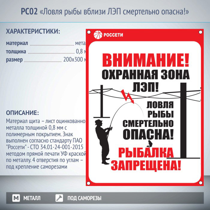 Знак «Ловля рыбы вблизи ЛЭП смертельно опасна!», РС02 (металл, 200х300 мм, отверстия под саморезы) в Верее купить