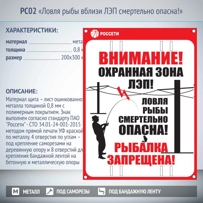 Знак «Ловля рыбы вблизи ЛЭП смертельно опасна!», РС02 (металл, 200х300 мм, отверстия под бандажную ленту) в Верее купить