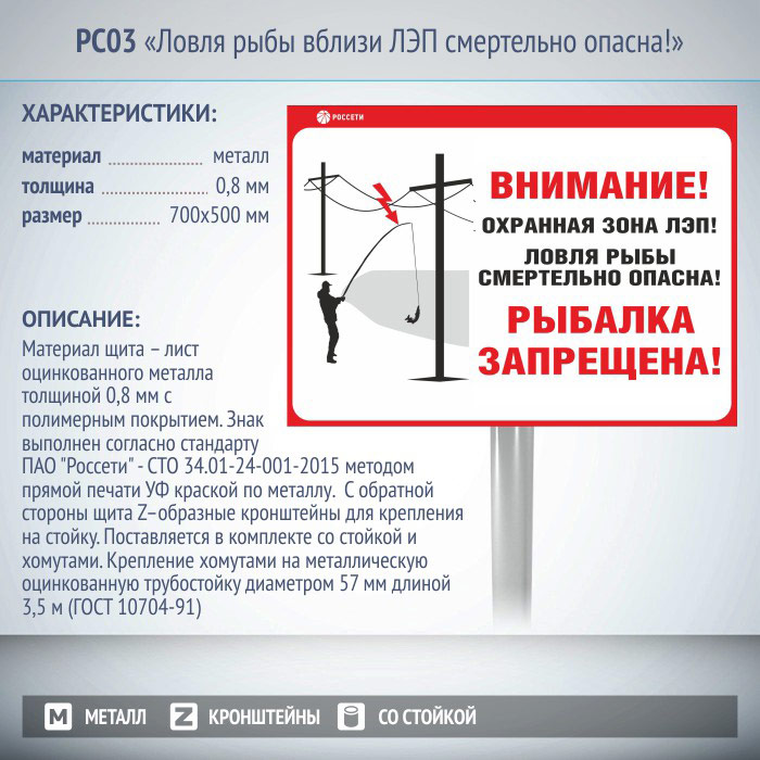 Информационный щит «Ловля рыбы вблизи ЛЭП смертельно опасна!», РС03 (металл, 700х500 мм, с металлической стойкой) в Верее купить