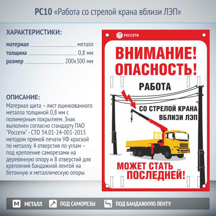 Знак «Работа со стрелой крана вблизи ЛЭП», РС10 (металл, 200х300 мм, отверстия под бандажную ленту) в Верее купить