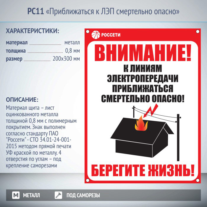 Знак «Приближаться к ЛЭП смертельно опасно», РС11 (металл, 200х300 мм, отверстия под саморезы) в Верее купить
