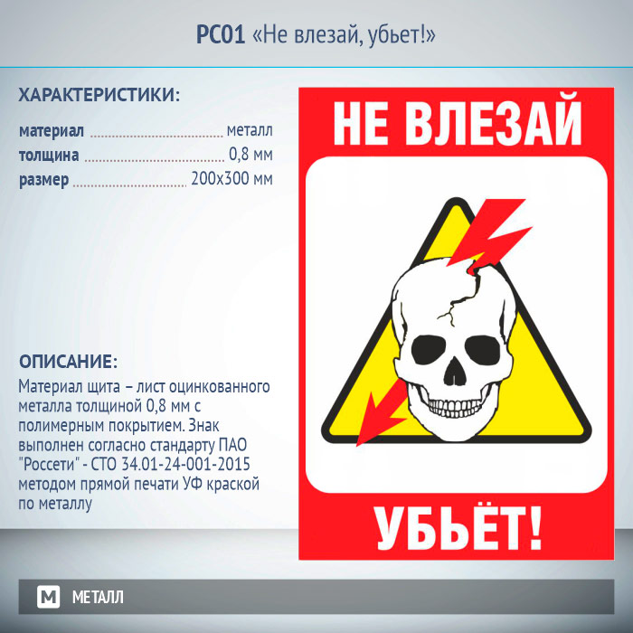 Знак «Не влезай, убьет!», РС01 (металл, 200х300 мм) в Верее купить