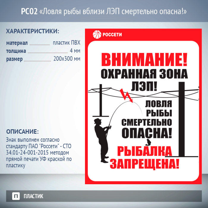 Знак «Ловля рыбы вблизи ЛЭП смертельно опасна!», РС02 (пластик 2 мм, 200х300 мм) в Верее купить