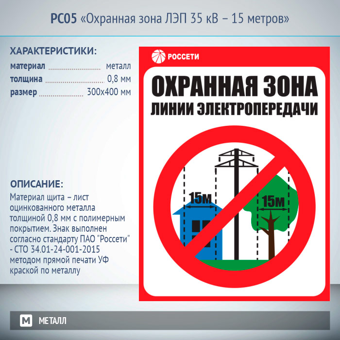 Знак «Охранная зона ЛЭП 35 кВ – 15 метров», РС05 (металл, 300х400 мм) в Верее купить