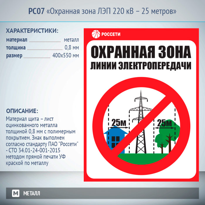 Знак «Охранная зона ЛЭП 220 кВ – 25 метров», РС07 (металл, 400х550 мм) в Верее купить