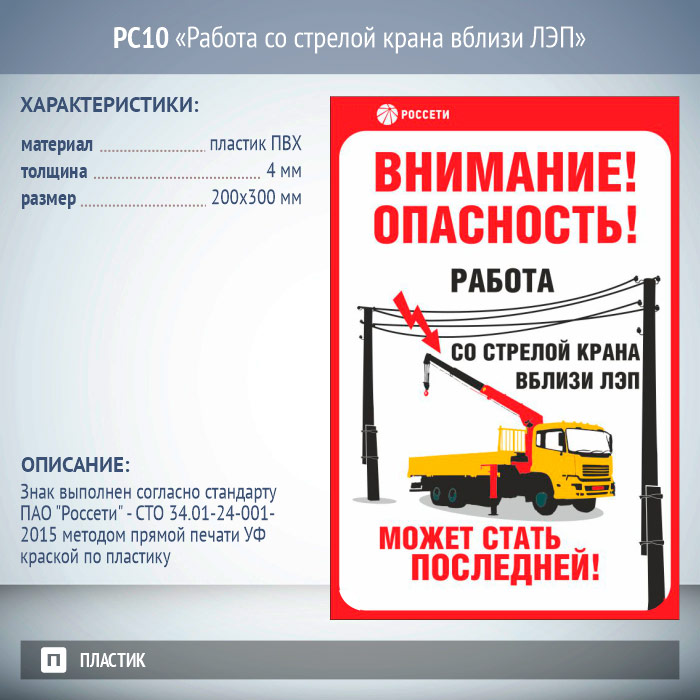 Знак «Работа со стрелой крана вблизи ЛЭП», РС10 (пластик 2 мм, 200х300 мм) в Верее купить