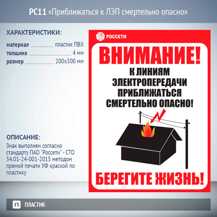 Знак «Приближаться к ЛЭП смертельно опасно», РС11 (пластик 2 мм, 200х300 мм) в Верее купить