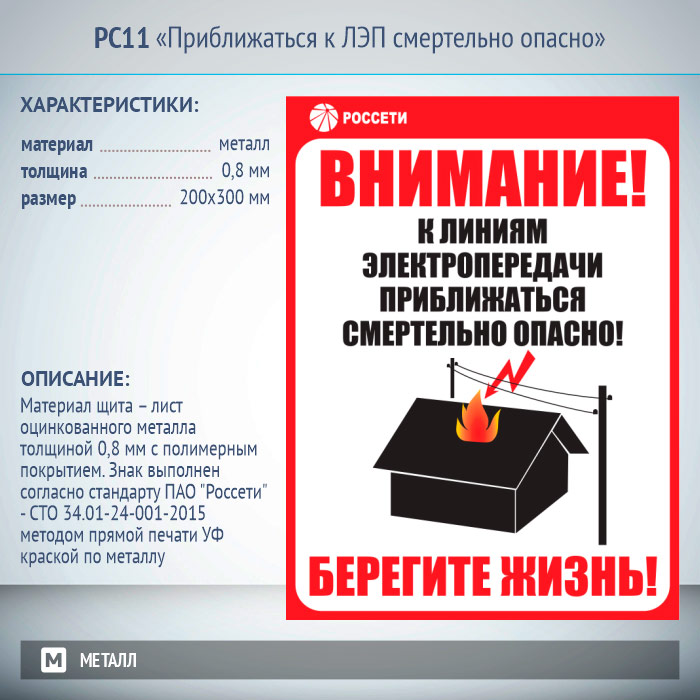 Знак «Приближаться к ЛЭП смертельно опасно», РС11 (металл, 200х300 мм) в Верее купить