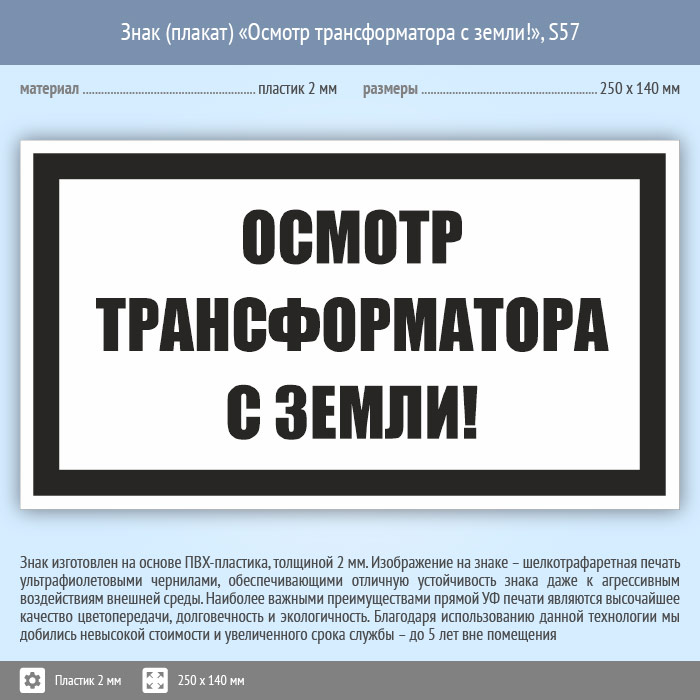 Знак (плакат) «Осмотр трансформатора с земли!», S57 (пластик, 250х140 мм) в Верее купить