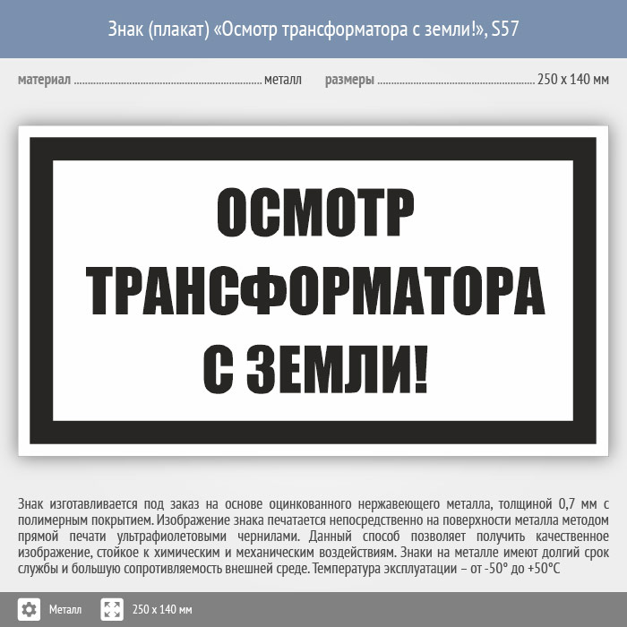 Знак (плакат) «Осмотр трансформатора с земли!», S57 (металл, 250х140 мм) в Верее купить