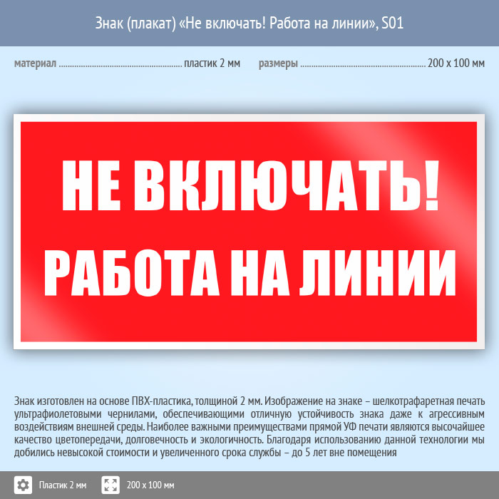 Знак (плакат) «Не включать! Работа на линии», S01 (пластик, 200х100 мм) в Верее купить