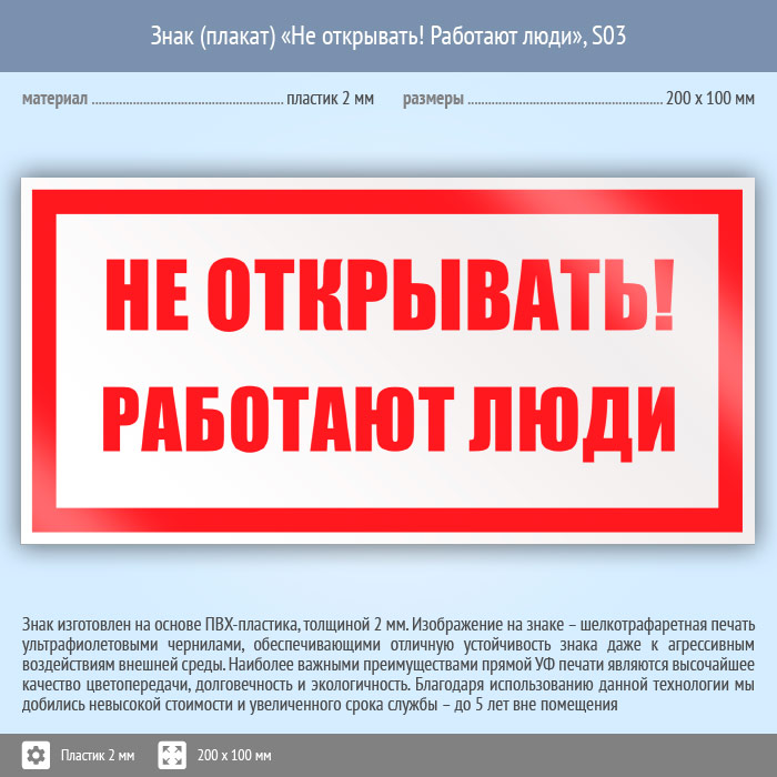 Знак (плакат) «Не открывать! Работают люди», S03 (пластик, 200х100 мм) в Верее купить
