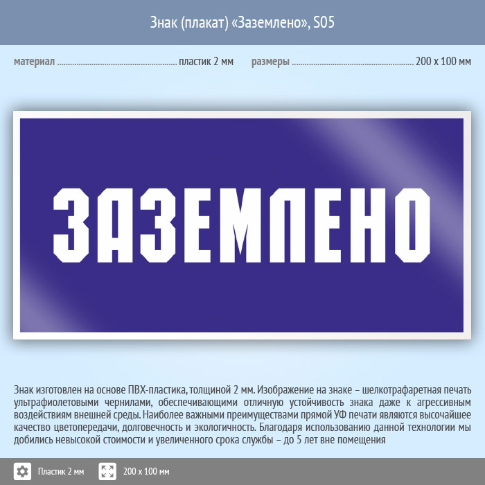 Знак (плакат) «Заземлено», S05 (пластик, 200х100 мм) в Верее купить