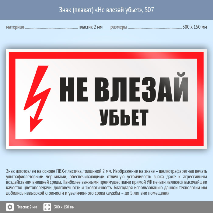 Знак (плакат) «Не влезай убьет», S07 (пластик, 300х150 мм) в Верее купить