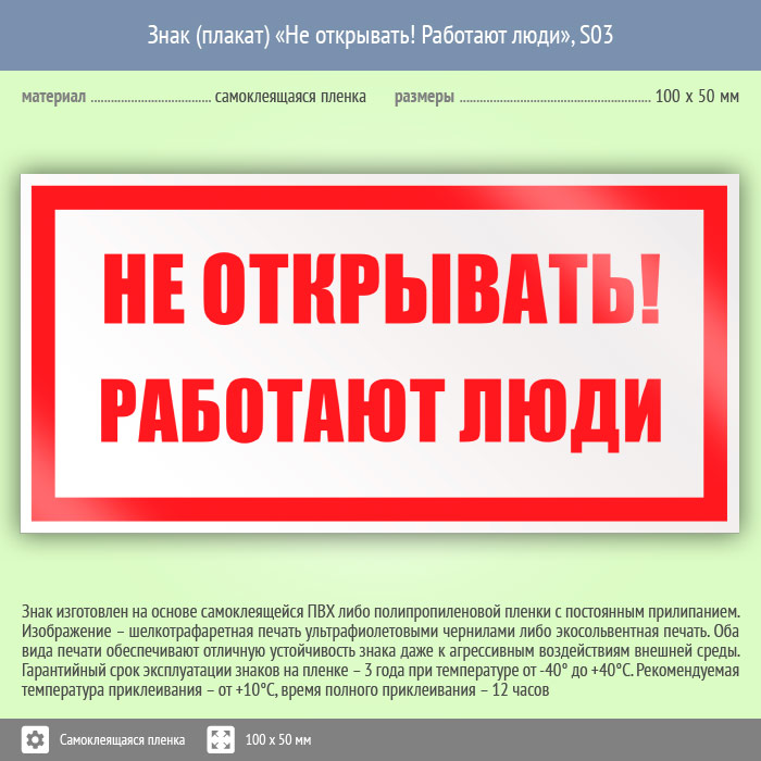 Знак (плакат) «Не открывать! Работают люди», S03 (пленка, 100х50 мм) в Верее купить