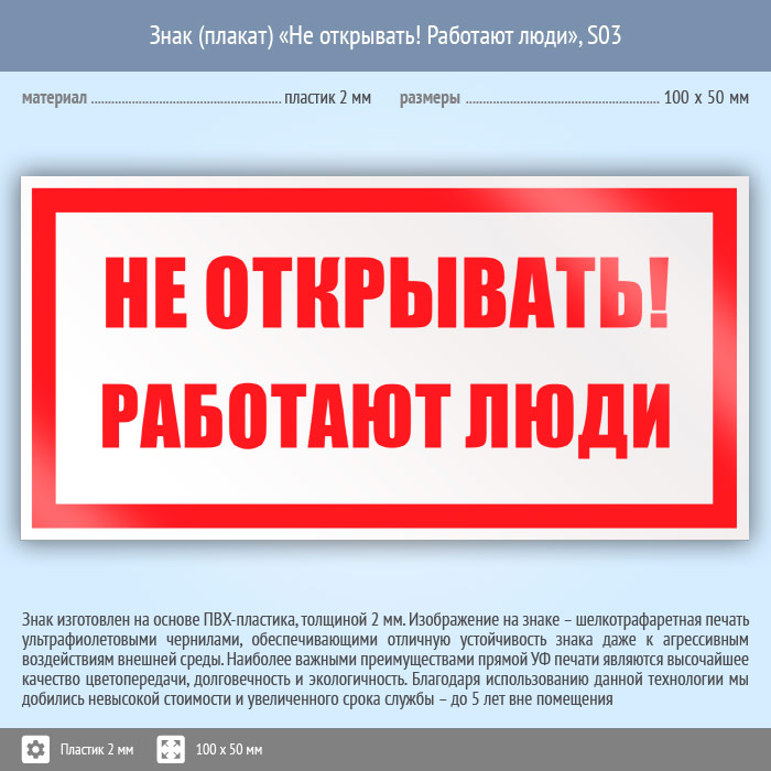Знак (плакат) «Не открывать! Работают люди», S03 (пластик, 100х50 мм) в Верее купить
