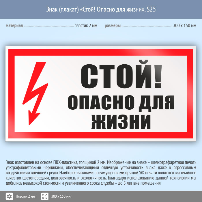 Знак (плакат) «Стой! Опасно для жизни», S25 (пластик, 300х150 мм) в Верее купить