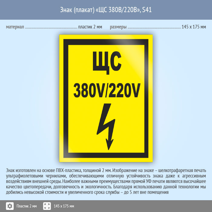 Знак (плакат) «ЩС 380В/220В», S41 (пластик, 145х175 мм) в Верее купить