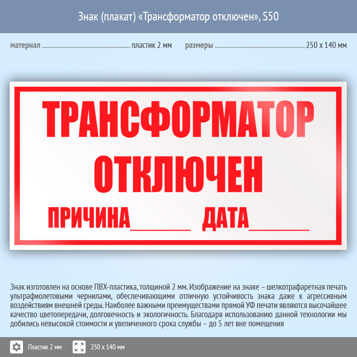 Знак (плакат) «Трансформатор отключен», S50 (пластик, 250х140 мм) в Верее купить
