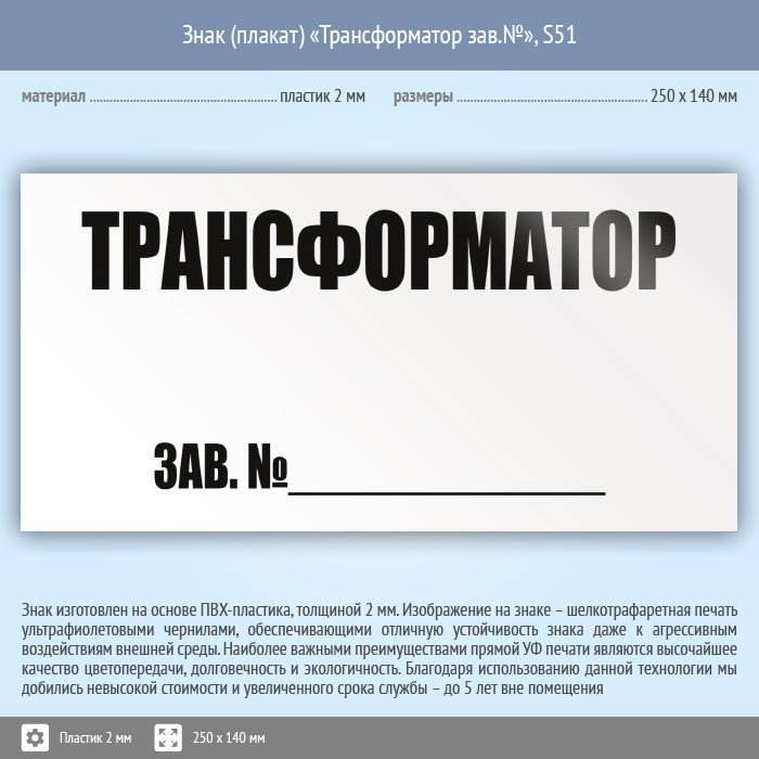 Знак (плакат) «Трансформатор зав.№», S51 (пластик, 250х140 мм) в Верее купить
