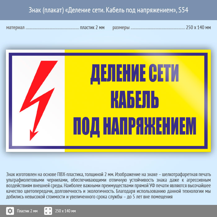 Знак (плакат) «Деление сети. Кабель под напряжением», S54 (пластик, 250х140 мм) в Верее купить