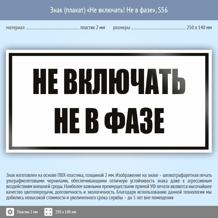 Знак (плакат) «Не включать! Не в фазе», S56 (пластик, 250х140 мм) в Верее купить