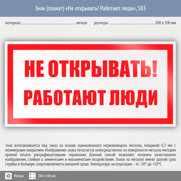 Знак (плакат) «Не открывать! Работают люди», S03 (металл, 200х100 мм) в Верее купить