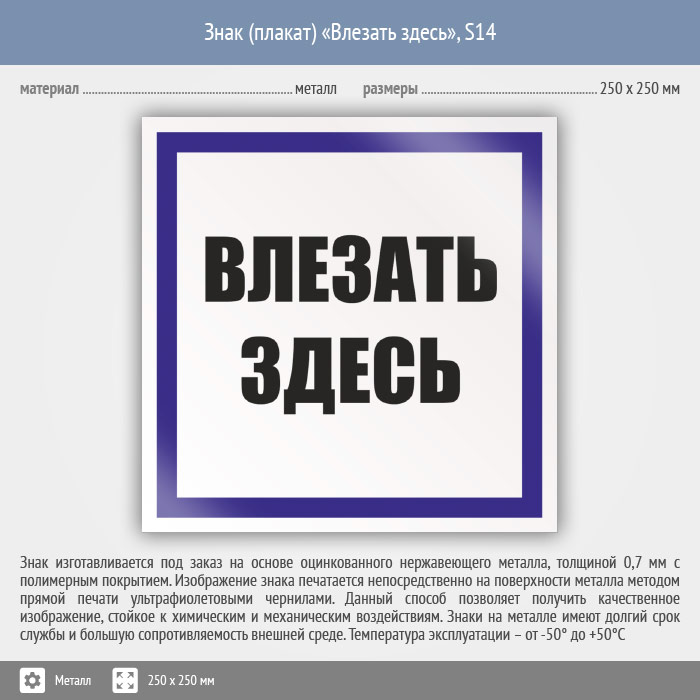 Знак (плакат) «Влезать здесь», S14 (металл, 250х250 мм) в Верее купить
