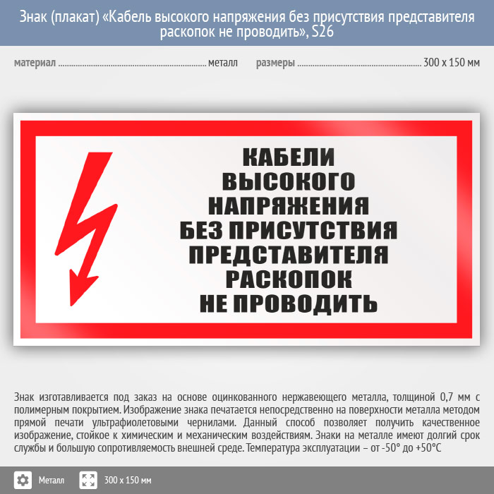 Знак (плакат) «Кабель высокого напряжения без присутствия представителя раскопок не проводить», S26 (металл, 300х150 мм) в Верее купить