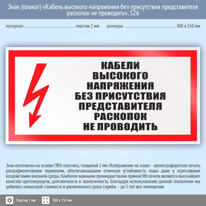 Знак (плакат) «Кабель высокого напряжения без присутствия представителя раскопок не проводить», S26 (пластик, 300х150 мм) в Верее купить
