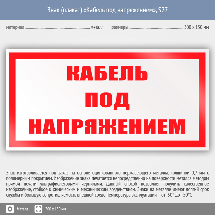 Знак (плакат) «Кабель под напряжением», S27 (металл, 300х150 мм) в Верее купить